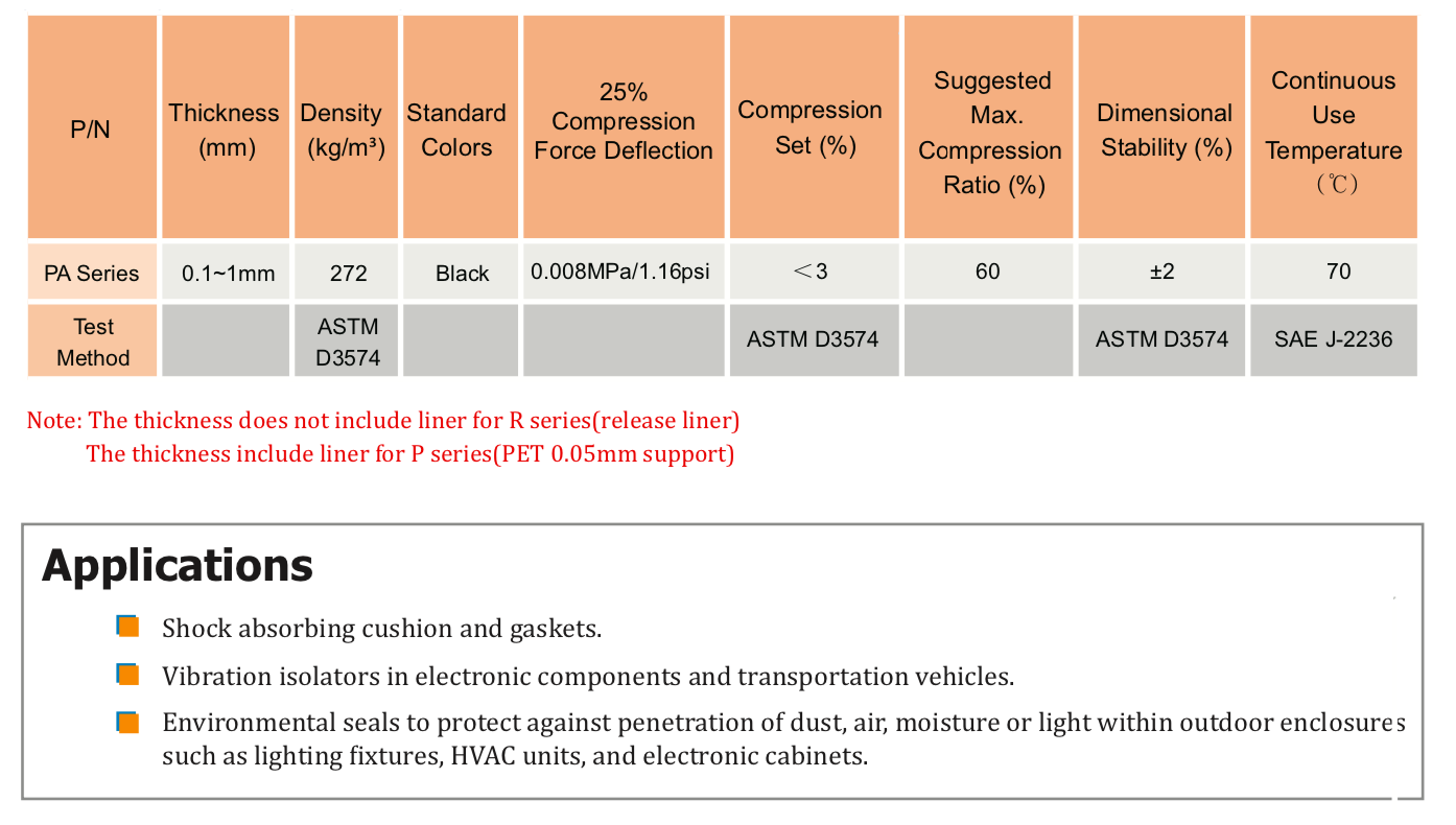 TM 丙烯酸泡棉 PA 系列特別柔軟,可提供超薄到中等厚度。PA系列具有良好的自粘合能力、低壓縮永久變形率、優(yōu)異的沖擊吸收和抗振動性。" />